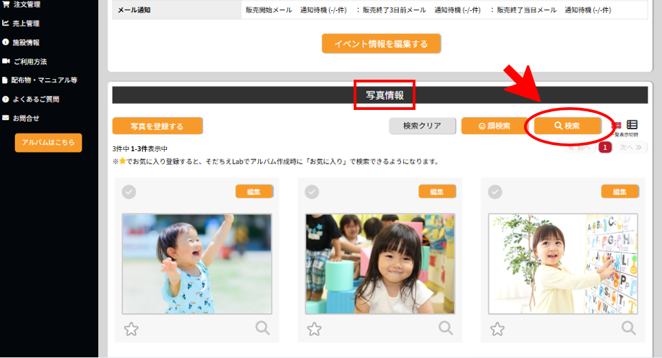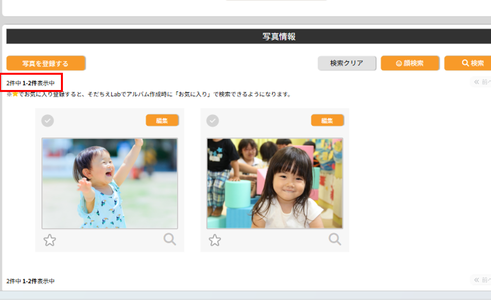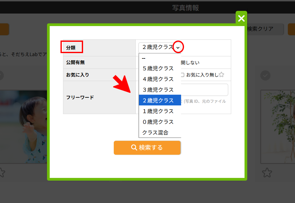 検索後は分類名「2歳児クラス」にアップロードされた写真だけが表示されます。