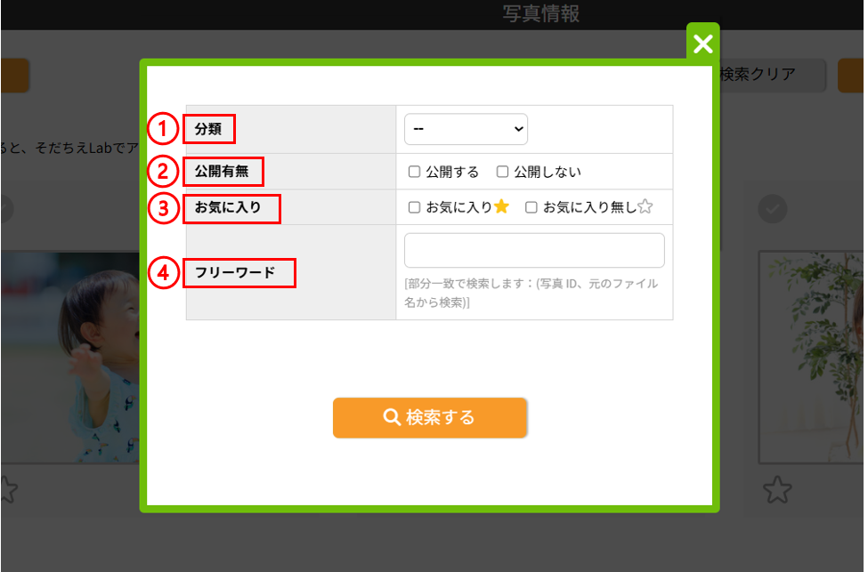 4.フリーワード:特定の写真だけを確認したい場合は、写真IDや撮影端末に保存されている元ファイル名を入力します。