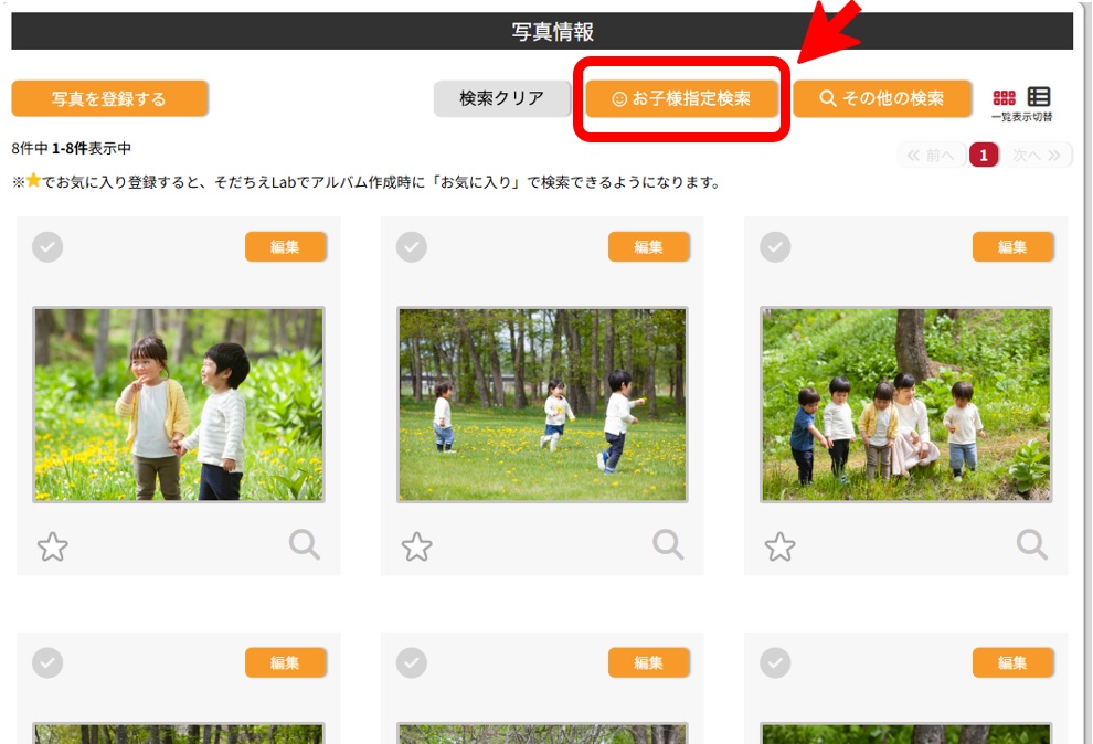 管理画面上で、指定したお子様の写っている写真だけを確認できます。