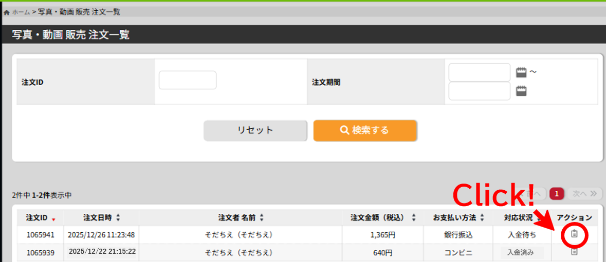 「注文管理」の「写真・動画販売注文一覧」を押します。