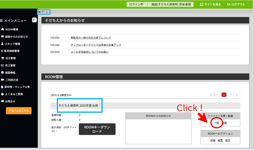 確認したいROOMの「イベント・写真・動画」の「一覧」を選択します。