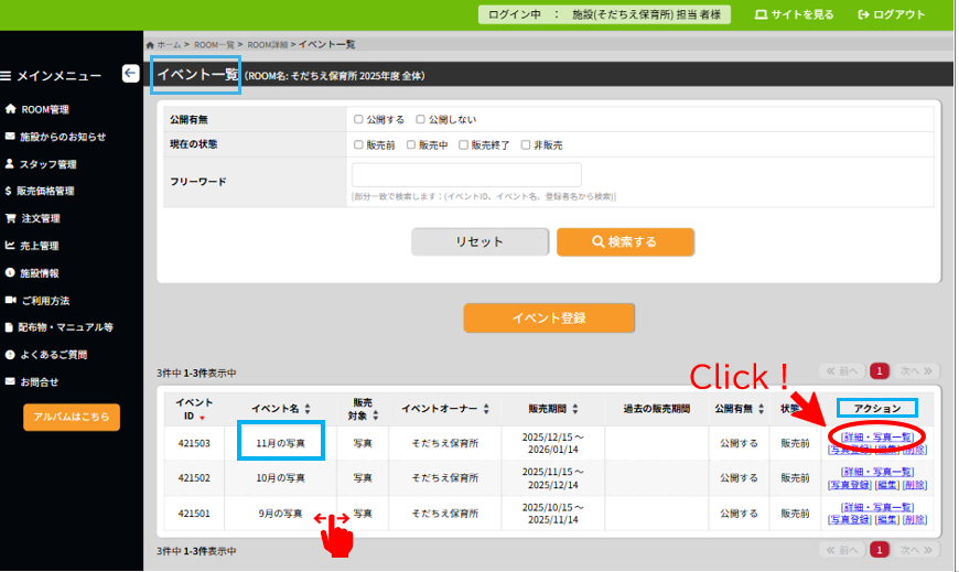 ② イベント一覧から確認したいイベントの項目「アクション」の「詳細・写真一覧」を選択します。
