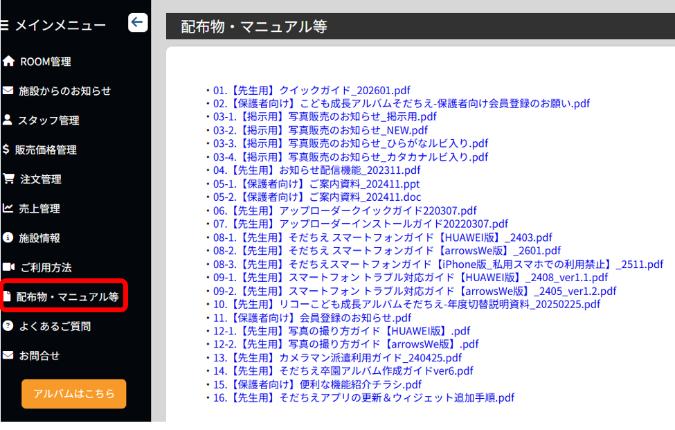 管理画面のメインメニュー>配布物・マニュアル等からは様々な配布用資料やマニュアルがダウンロードできます。
