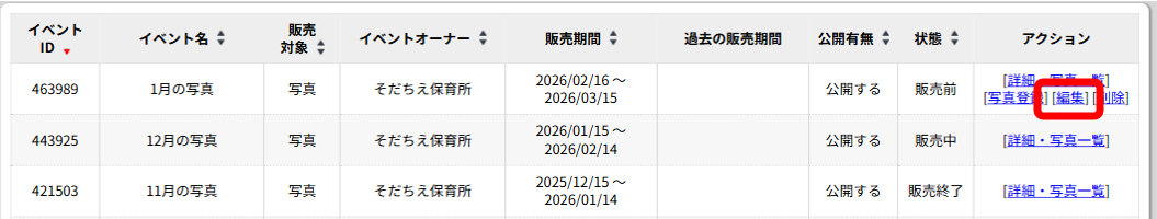 対象イベントを編集し、販売期間を変更する。