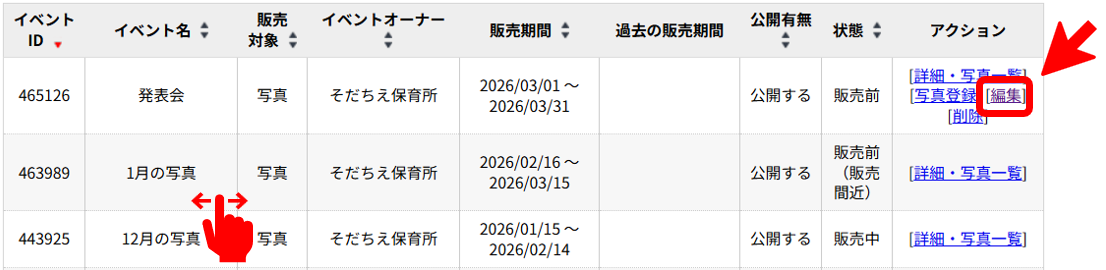 ※スマートフォンの場合はイベント一覧の表を右にスクロールすると項目『アクション』がでてきます。