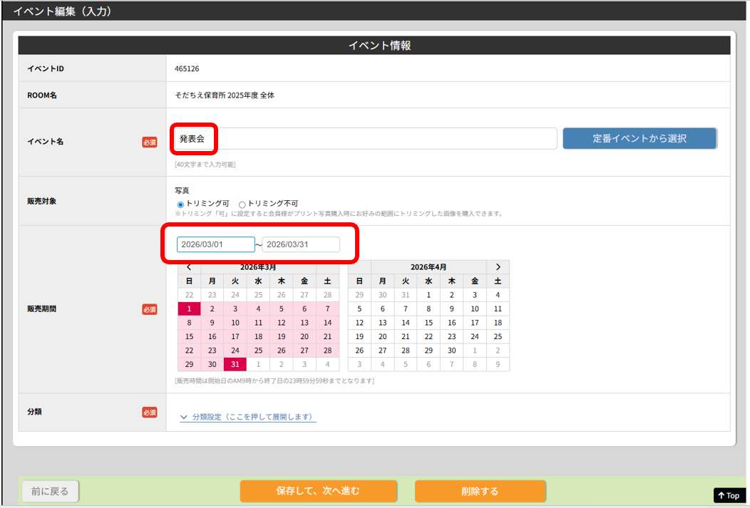 ③イベント名や販売期間の変更をし、『保存して、次へ進む』を押すと変更完了です。