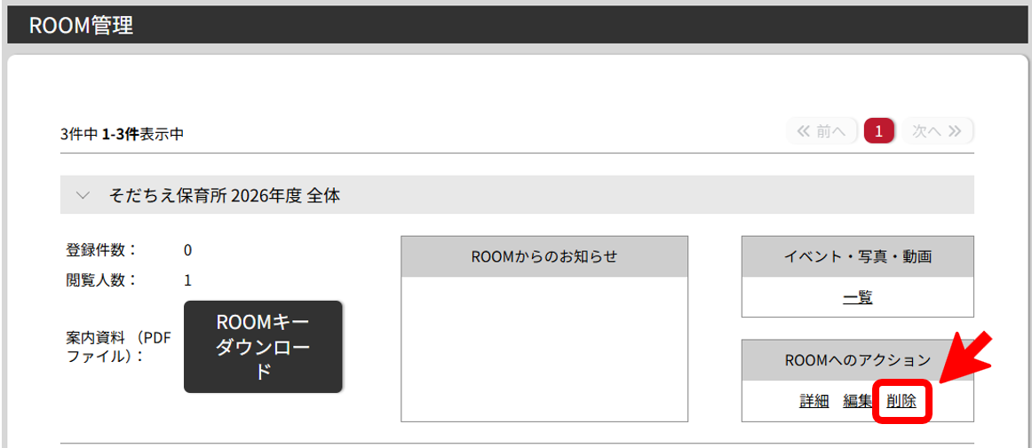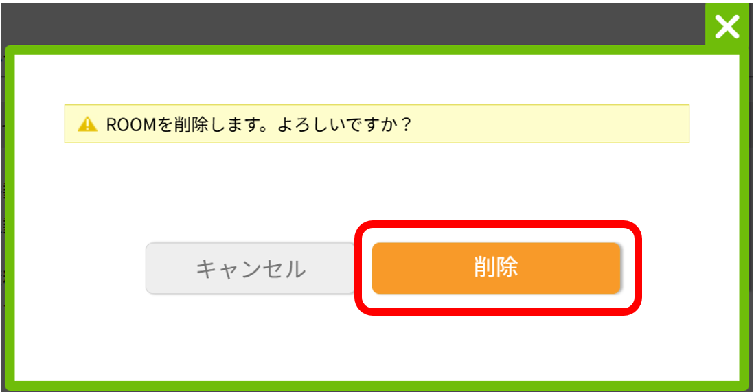 ROOMを削除したい 2026年02月18日 05:50 更新 ROOMの削除は、対象のROOMにイベントが1つも作成されていない場合に限り可能です。 ROOMを削除したいときは、管理画面トップページの『ROOM管理』で対象のROOMの『ROOMへのアクション』>『削除』を押します。下記の画面で『削除』を押します。