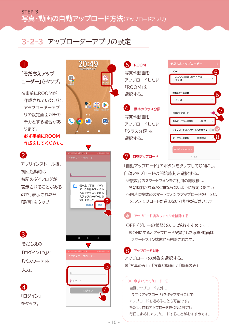 撮影用スマートフォンにインストールされているそだちえアップローダーアプリからアップロードする手順です。