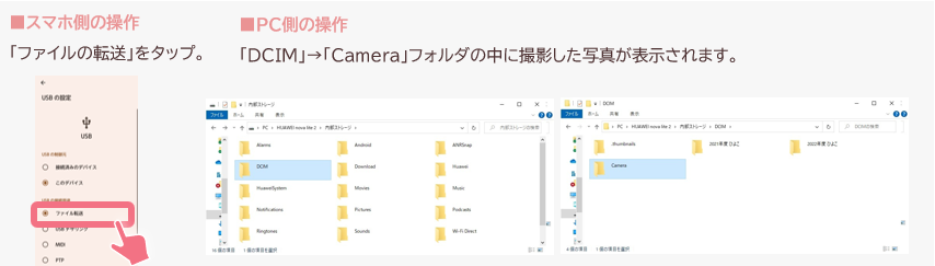 ①充電ケーブルでスマホをパソコンにUSB接続して転送